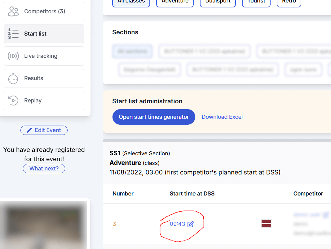 Open the public event view → Start List, then click the edit icon under the column “Start time at DSS” to adjust each rider’s DSS start time individually — either before the event or on-site at the DSS start by the start referee.